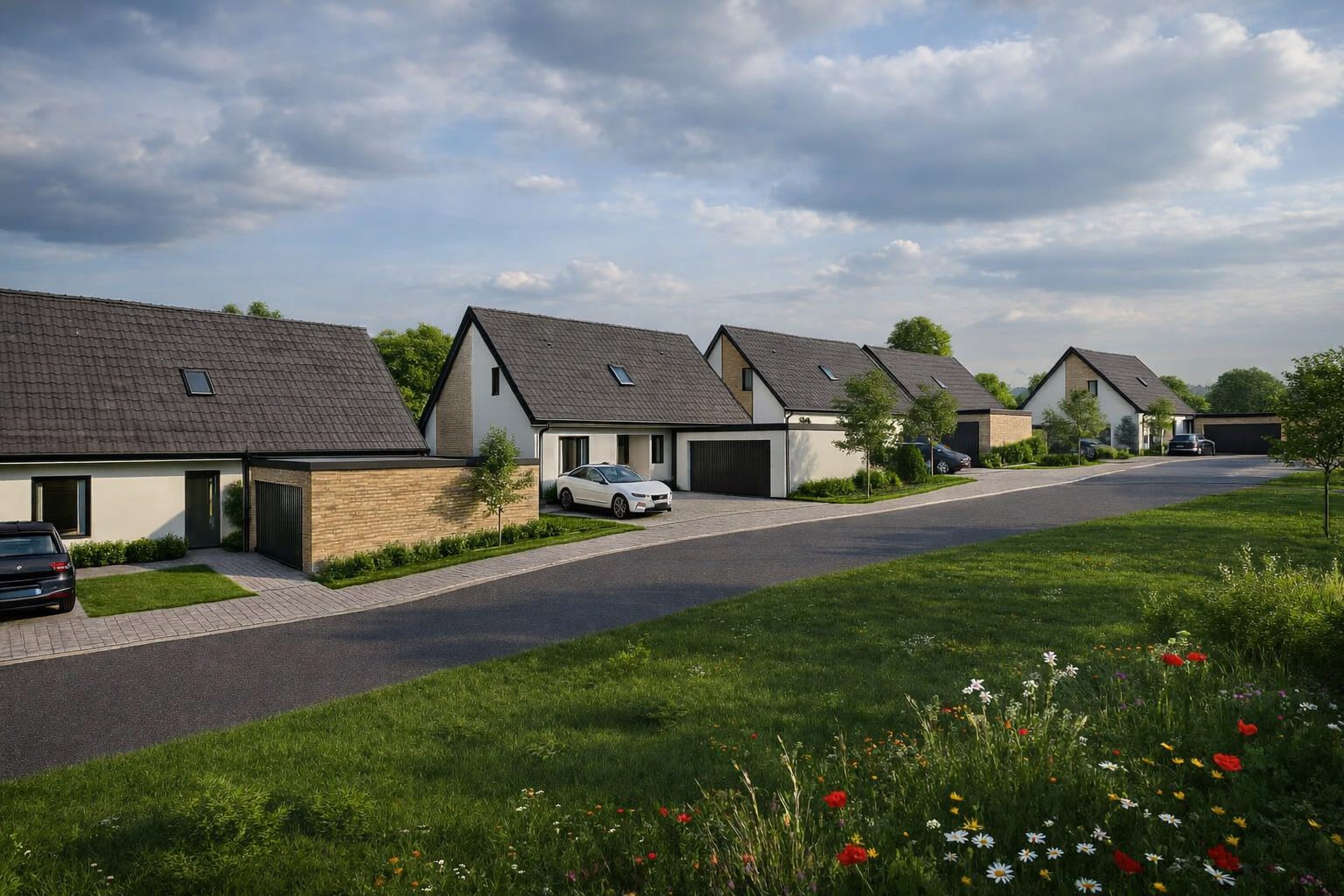 The masterplan includes a mix of five chalet bungalows and five two-storey, highly contemporary homes. The chalet bungalows are designed with accessibility and futureproofing in mind, offering versatile living with modern layouts and generous outdoor space. The two-storey dwellings take a bold architectural approach, combining sharp lines, large glazing, and sustainable materials to create a distinctive modern edge that enhances the setting without overpowering it.